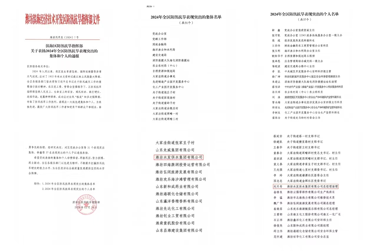 近日,濰坊市濱海區(qū)防汛抗旱指揮部下發(fā)《關(guān)于表揚2024年全區(qū)防汛抗旱表現(xiàn)突出的集體和個人的通報》,濰坊水發(fā)供水集團及公司員工劉天奇,分別榮獲防汛抗旱表現(xiàn)突出的集體和個人表彰。